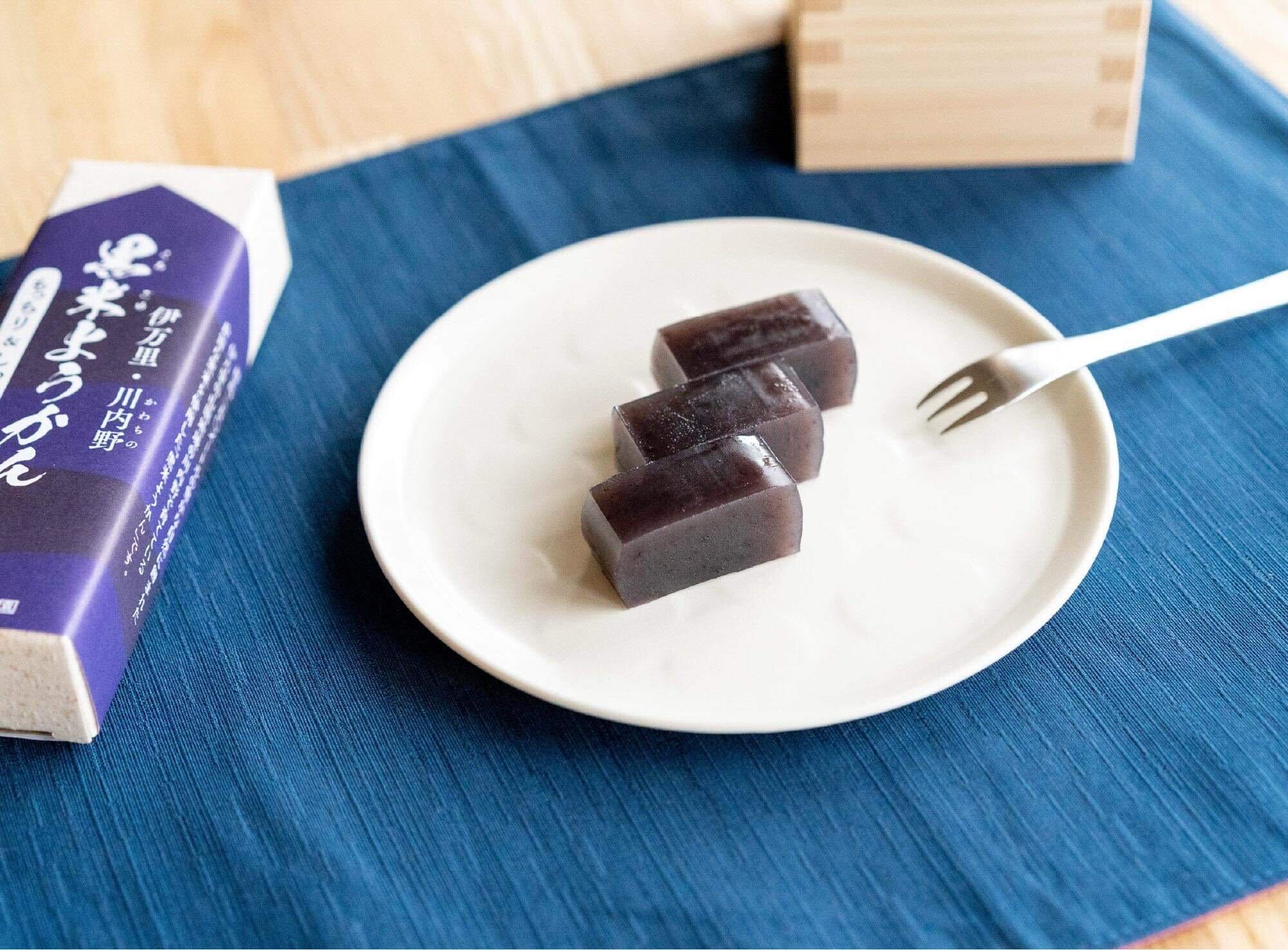 この羊羹は、佐賀県伊万里市のみで栽培している「紫福糯」が原種の黒米を使用しています。「紫紺の発色の良さ」と「もっちり、しっとり」した食感が特徴の川内野ブランド米です。